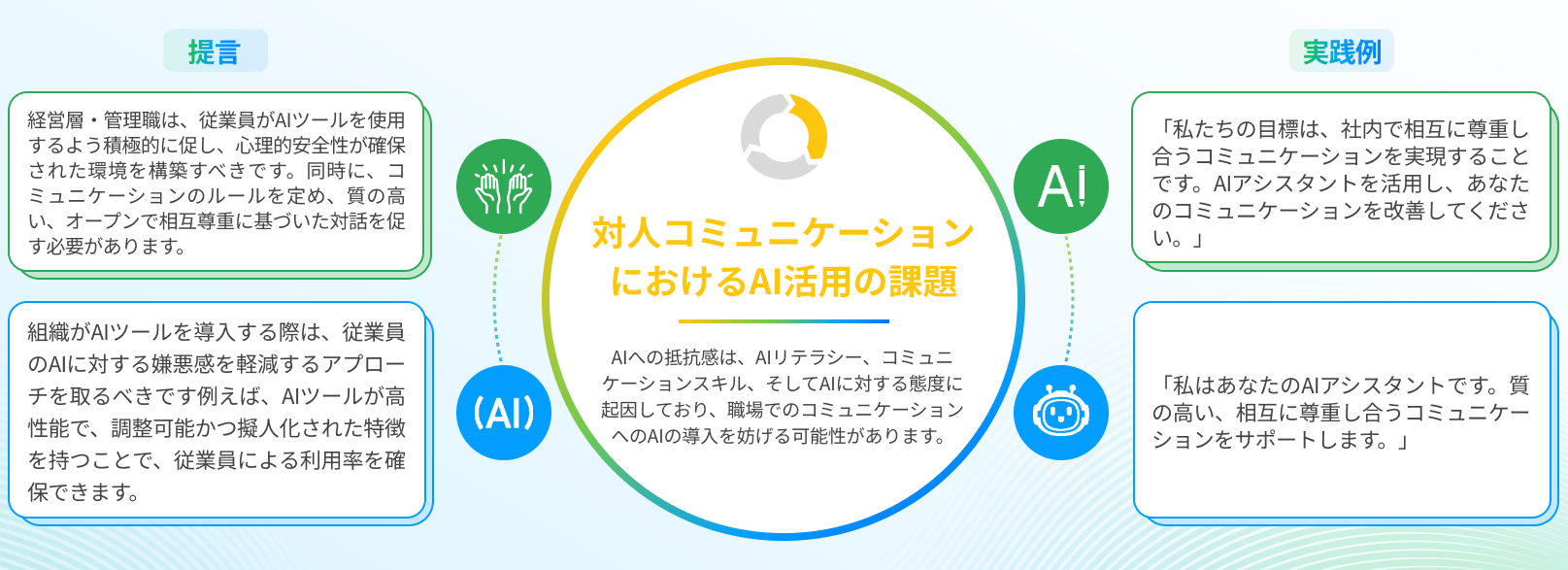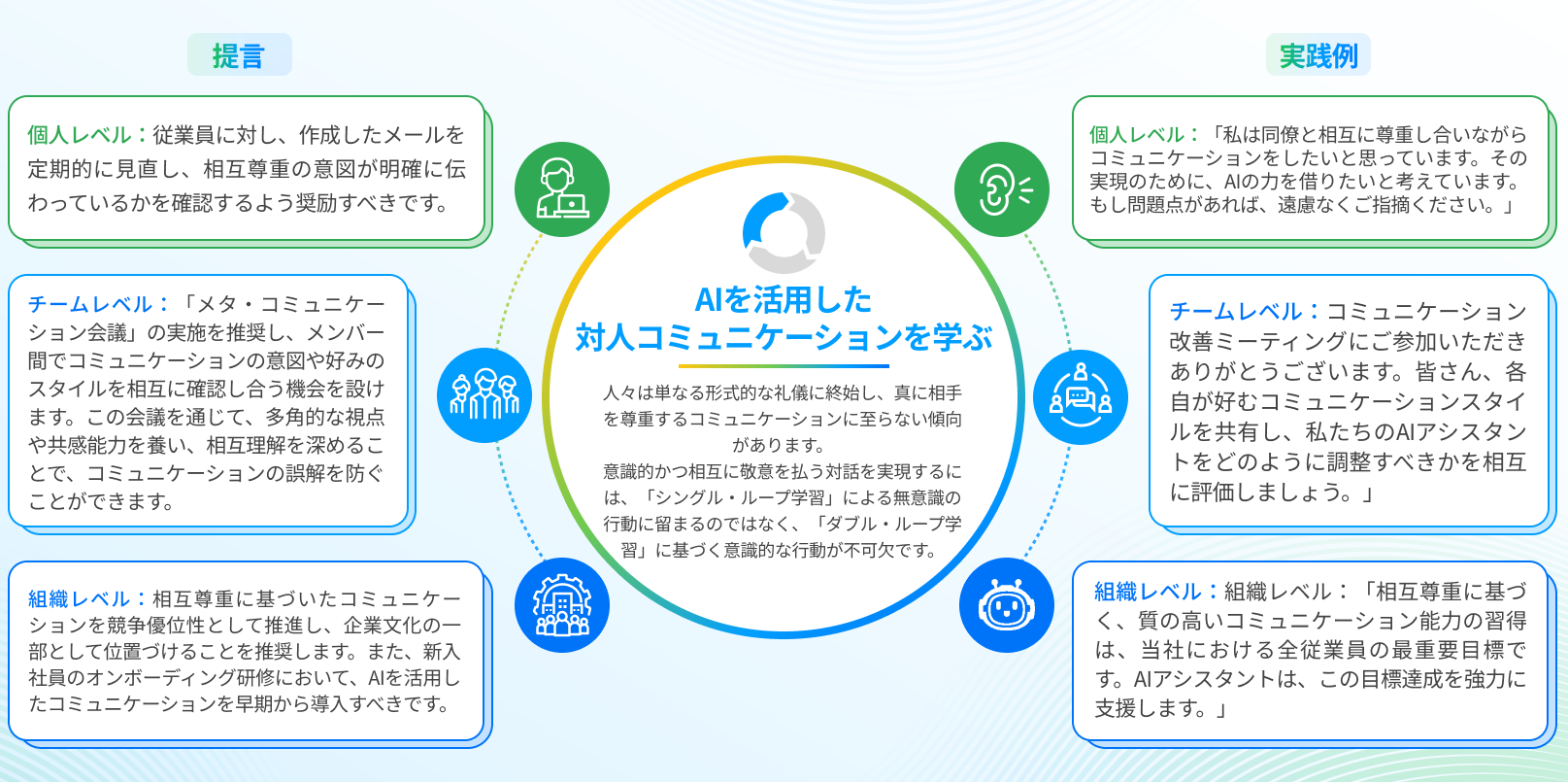 AIは汎用的で平均化された丁寧な表現を生成しがちです。リーダーの重要な役割は、社員がAIを活用し、相手への敬意がより伝わるように個別化されたコミュニケーションを強化するように導くことです。