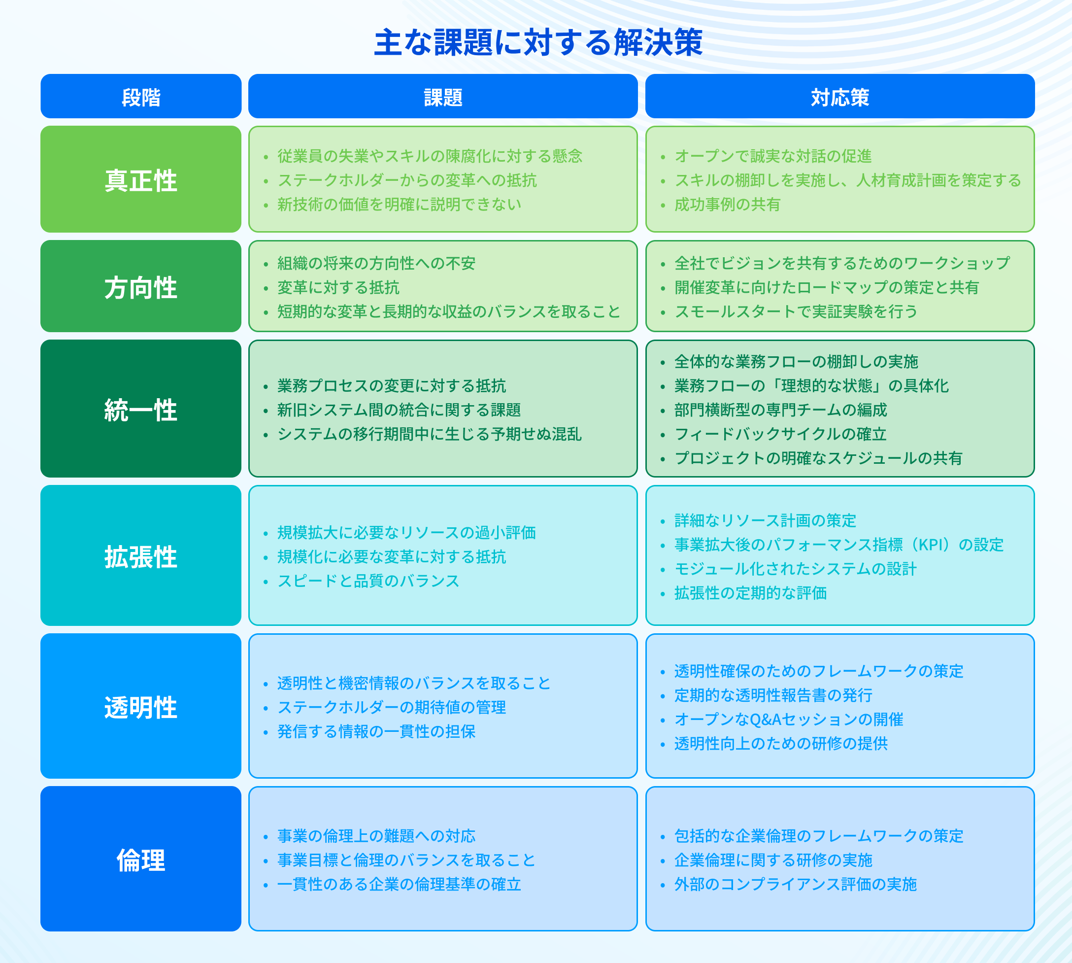 - 事業運営の健全性(Operational Integrity):新しいツールやプロセスを統合する中で、事業運営の安定性、効率性、レジリエンスをいかに確保するか。