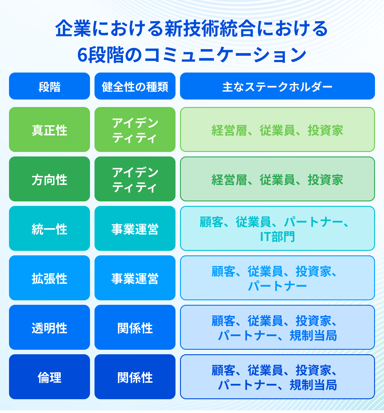 関係性の健全性とは、従業員、顧客、投資家、パートナー、そして規制当局を含む、すべての主要なステークホルダーと健全で相互に信頼し合える関係を維持することを指します。技術統合のプロセスにおける対話では、あらゆる意思決定と行動の透明性を徹底し、倫理的責任を果たす姿勢が問われます。