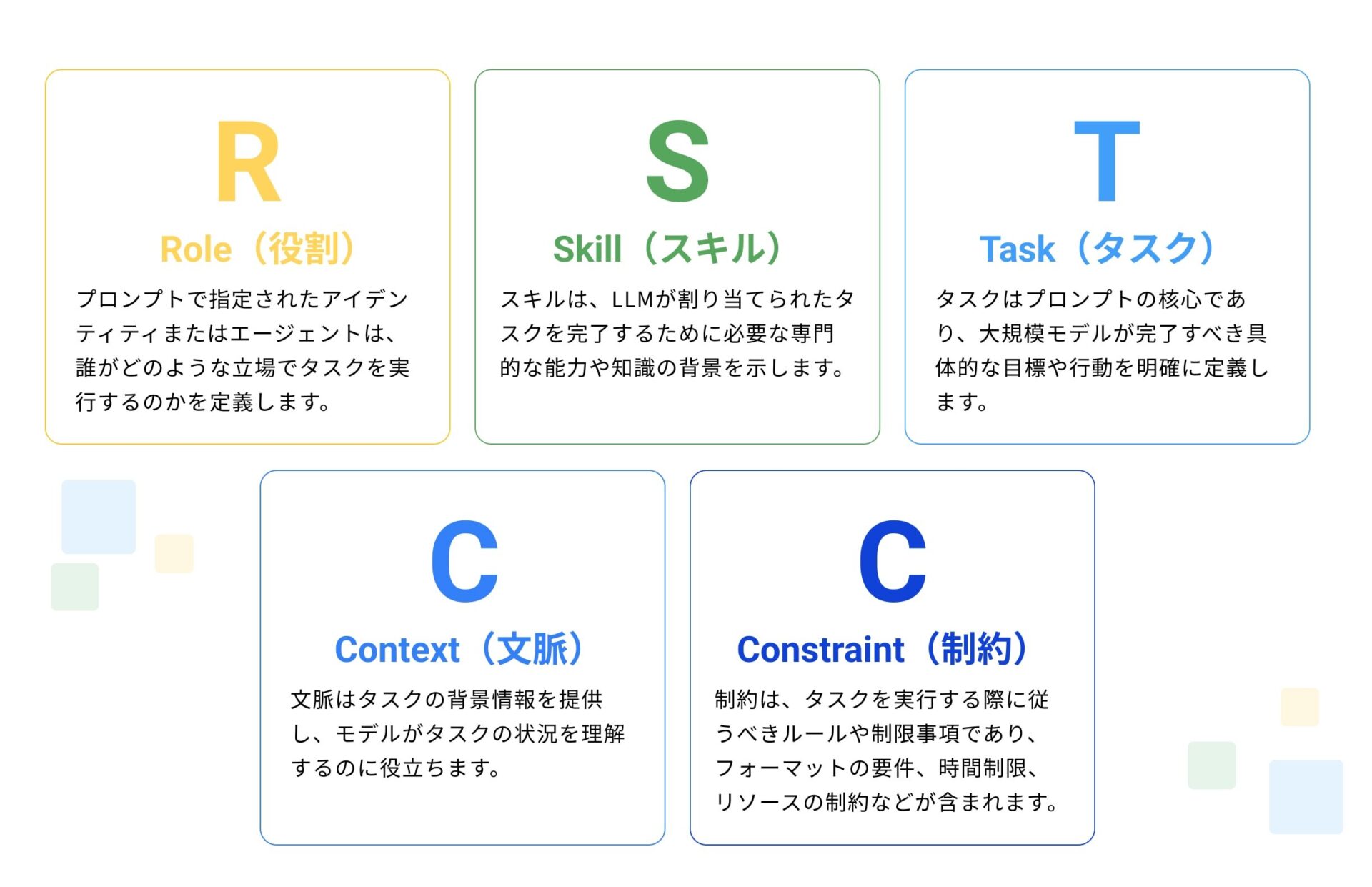 - C (Constraint):制約 – アウトプットの形式や条件を指定する。