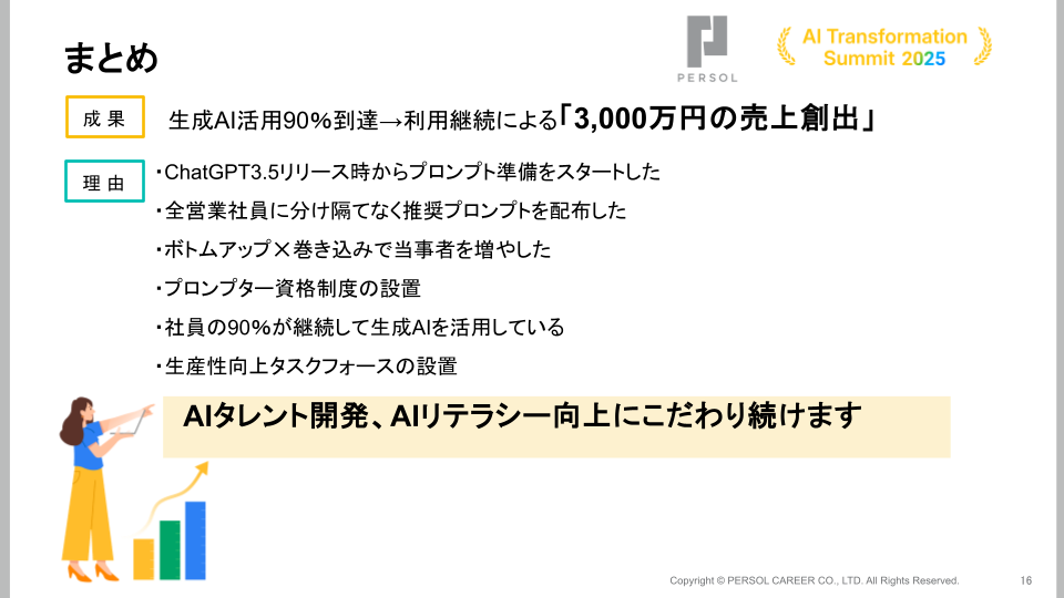 住永氏の取り組みが示す通り、全社員のAIリテラシー、特にプロンプトリテラシーを高める「AIタレント開発」は、企業が競争優位性を確立し、継続的に成長するための必須課題であることが強く印象付けられました。