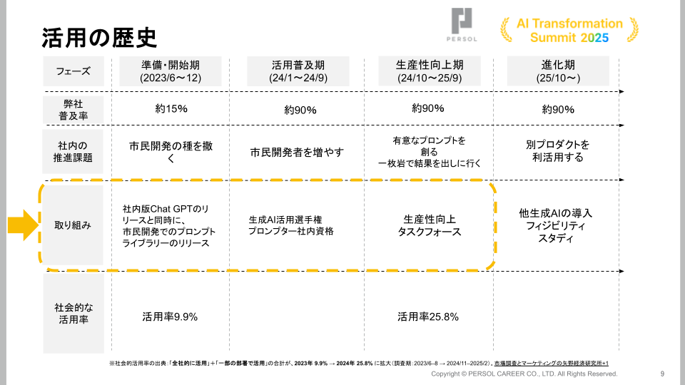 住永氏は、ご自身のキャリアアドバイザーとしての経験と、2023年6月の生成AIとの出会いが、「淘汰されたくない、もっと使いこなせるようになりたい」という強い思いにつながり、経営からの指示ではないボトムアップでのAI普及活動を始めたと紹介しました。