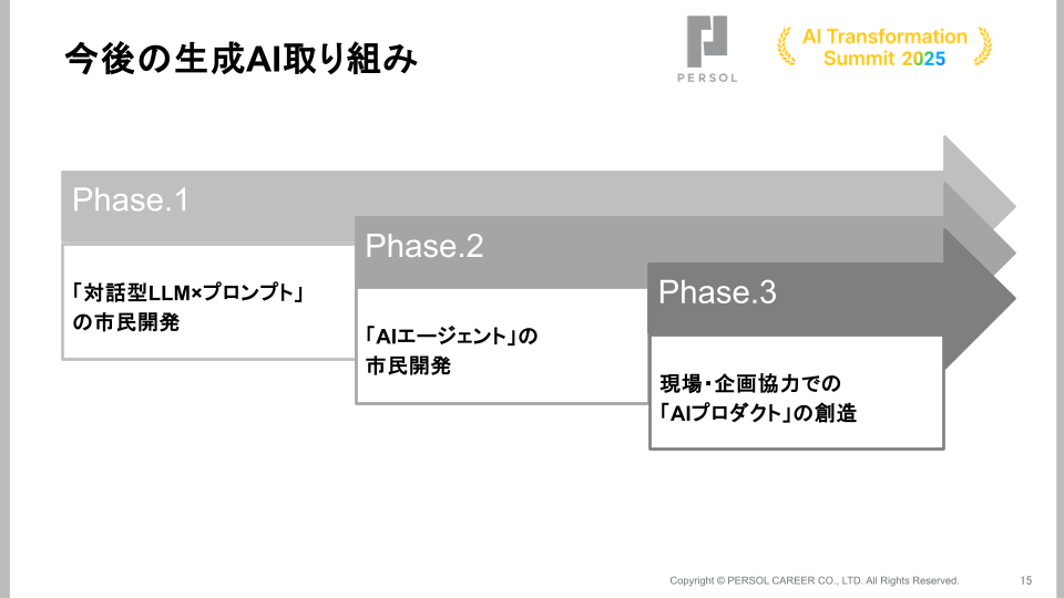 住永氏は、今後の方針として、対話型LLMでのプロンプトの市民開発をベースに、自律型でタスクを処理する「AIエージェント」の市民開発、そして現場と企画部門の協力による「AIプロダクト」の創造へと取り組んでいくと語りました。