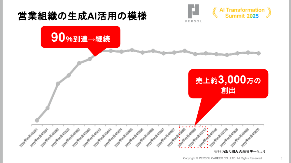 パーソルキャリアでは、2023年11月の社内版ChatGPTリリース後、わずか半年で活用率90%を達成し、その後の継続的な日常使いも実現しています。さらに、ある特定部門では2カ月間で約3,000万円(年間換算で約1億8,000万円)の売上増加という明確な成果を上げました。
