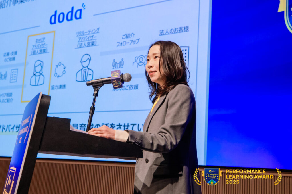 - 受賞理由: 大規模組織において、AI Chatbotによる話法トレーニングやレベル別カリキュラム配信など、学習者のUI/UXを追求し、「個別最適化された学習」を実現している点が高評価でした。優秀人財増加という行動変容までをトレースした姿勢が優れた手本として評価されました。