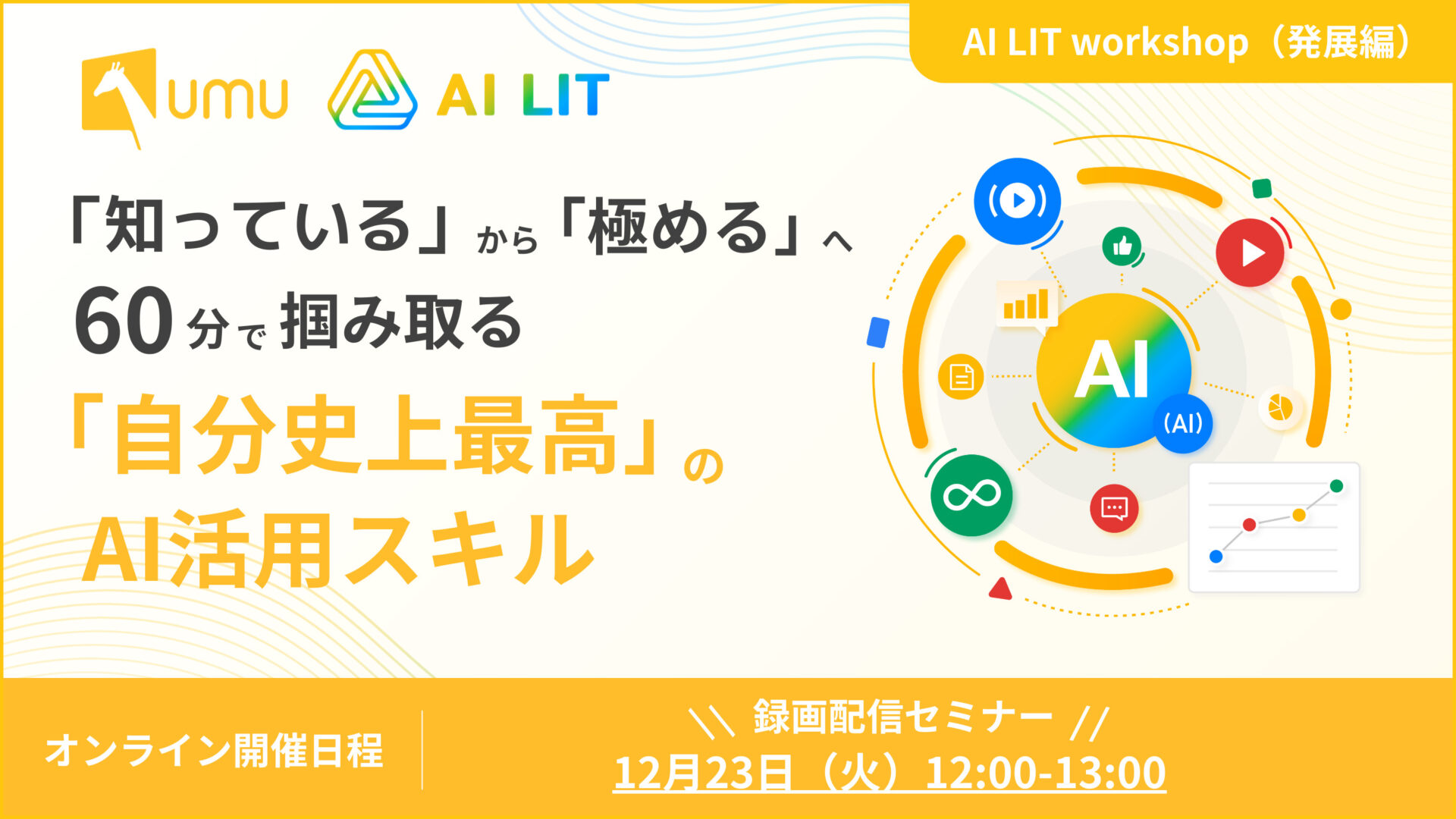 本セミナーは、そうした不安や疑問を解消し、AI時代に不可欠な基礎知識とスキルを体系的に学ぶための講座です。UMUが200以上の学術論文や業界レポートから得た知見を基に開発した 、AIを正しく理解し、効果的に活用するための「最初の第一歩」を、分かりやすく丁寧にガイドします。