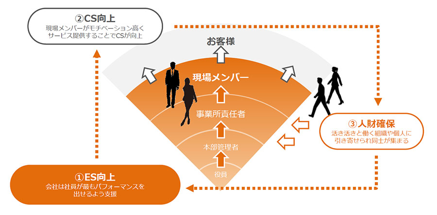 当本部では、「サービスマネジメントブランディング」という言葉を用いて、社員が幸せになることが重要と捉えています。これは端的に言うと「従業員満足度が上がれば、必然的に質のいいサービス提供に目が向き、共感できる人材が集まる好循環を醸成できる」という考えで、それをもとにメンバーの満足度向上に対しても全力で取り組んでいます。