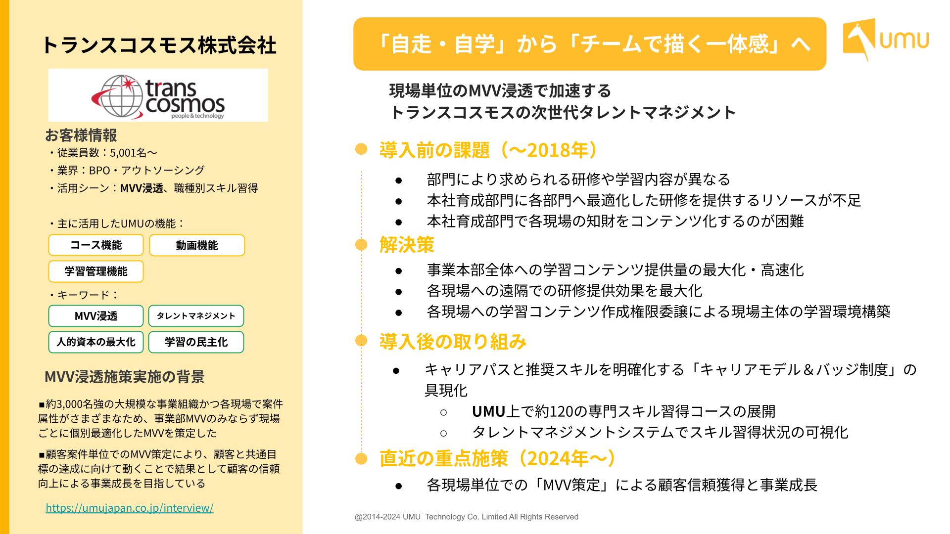 長年の活用で、UMUは単なる学習ツールから、いつでも参照・再利用できる「知の資産」へと変化しました。各部門が自らのMVV実現のために、「過去のコンテンツを今のバージョンにアップデートして使おう」「必要な研修は自分たちでUMUで作ろう」という自律的な動きは、MVVという目的を得て、さらに加速していくでしょう。