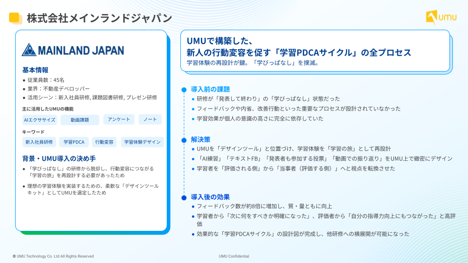 学習体験の再設計が鍵。メインランドジャパンがUMUで構築した、新人の行動変容を促す「学習PDCAサイクル」の全プロセス
