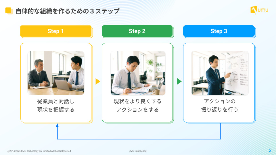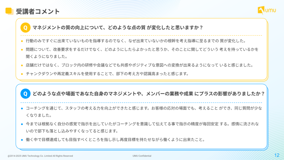 特に、マネジメントの土台となるコミュニケーションの“型”を、AIとの対話型トレーニング「UMU Chatbot」を通じて実践的に学べる点に革新性を感じました。コミュニケーションのような曖昧なスキルだからこそ、まずは再現性を高めるための「型」の習得が重要だと考えました。
