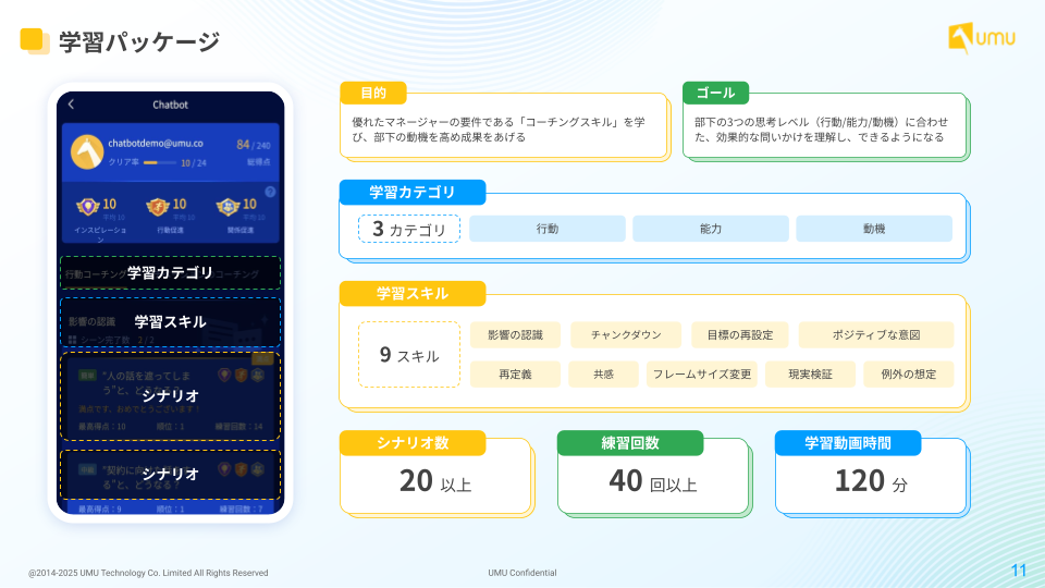 UMUは、インプット学習(eラーニング)に加え、「UMU Chatbot」の「マネージャーコーチングコース」を活用し、アウトプットを徹底的に強化する役割を担います。