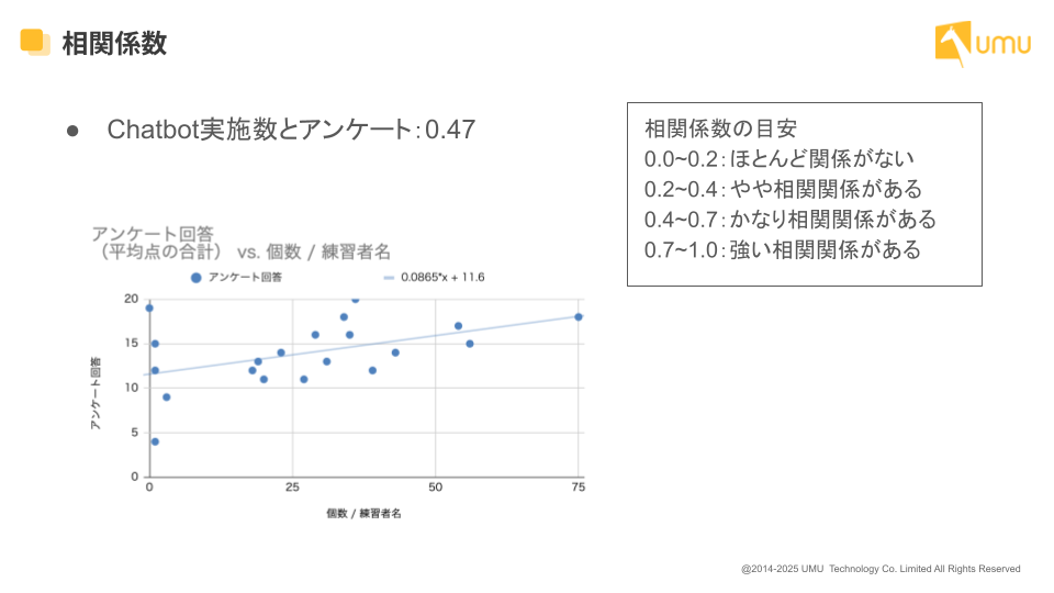 「UMU Chatbot」の練習回数と、受講者の自己評価アンケートの結果にも相関が見られ、練習量が多いほど行動変容を実感している傾向が確認できました。