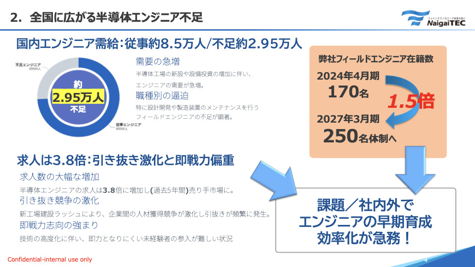 しかし、市場が拡大する一方で、それを支える「エンジニア」が圧倒的に不足しています。国内で約3万人が不足し、求人倍率は3.8倍という完全な売り手市場です。私たち内外テックグループにとっても、これは対岸の火事ではありません。2027年までに79名のエンジニアを採用し、育成しなければならないという目標があります。従来のOJT頼みの教育や、属人的な指導だけでは、このスピード感と規模感に対応することは不可能でした。そこで、社内外のエンジニア教育を抜本的に効率化すべく、「SEMIポータル構想」を立ち上げたのです。