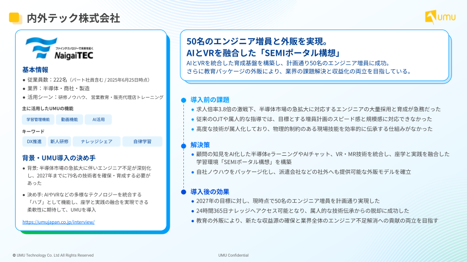 - 解決策:AI活用学習プラットフォーム「UMU」を基盤に、伝説的エンジニアの知見をAI化した半導体eラーニングやAIチャット、更にVR・MR技術を統合した「SEMIポータル構想」を構築した。