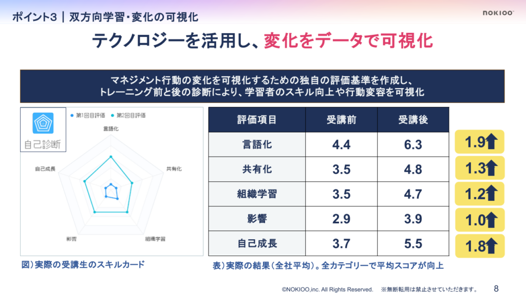 はい、特に「言語化」のスキルを重視しました。実際にプログラムの成果として、この言語化のスキルが大きく向上しましたが、これは意図的に設計した結果です。スキルカードの各項目には複数のアセスメント質問が紐づいており、ディスカッションワークや集合研修の場を通じて、「自分の言葉で言語化しよう」というメッセージを繰り返し伝え続けました。