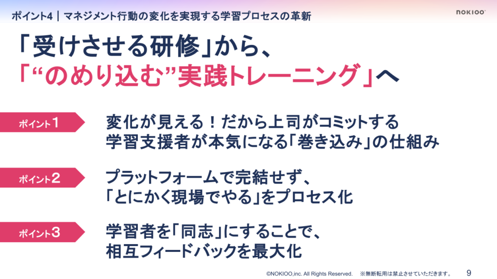 そして、プラットフォームにコンテンツを載せて終わり、としないこと。そこで学んだことを、いかにして実際の現場で使われるようにするか。上司が実践の場を与えていくことも含め、学びと実践が有機的に結びつくことで初めて、組織は本当に変わっていくのだと確信しています。