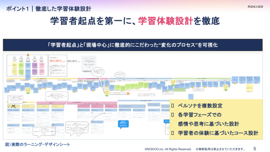 すべてを学習者視点で考えることを徹底しました。例えば、学習者がつまずきそうなタイミングで、上司からどのような言葉をかけてもらえたら嬉しいか。インプットが続く中で、どこに仲間と対話する機会を設ければ、学びが深まるか。そういった具体的な支援策を一つひとつ丁寧に検討していきました。