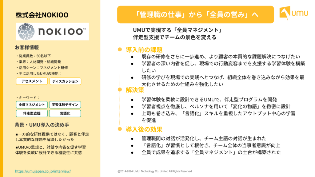 「管理職の仕事」から「全員の営み」へ。NOKIOOが提唱する「全員マネジメント」をUMUで実現