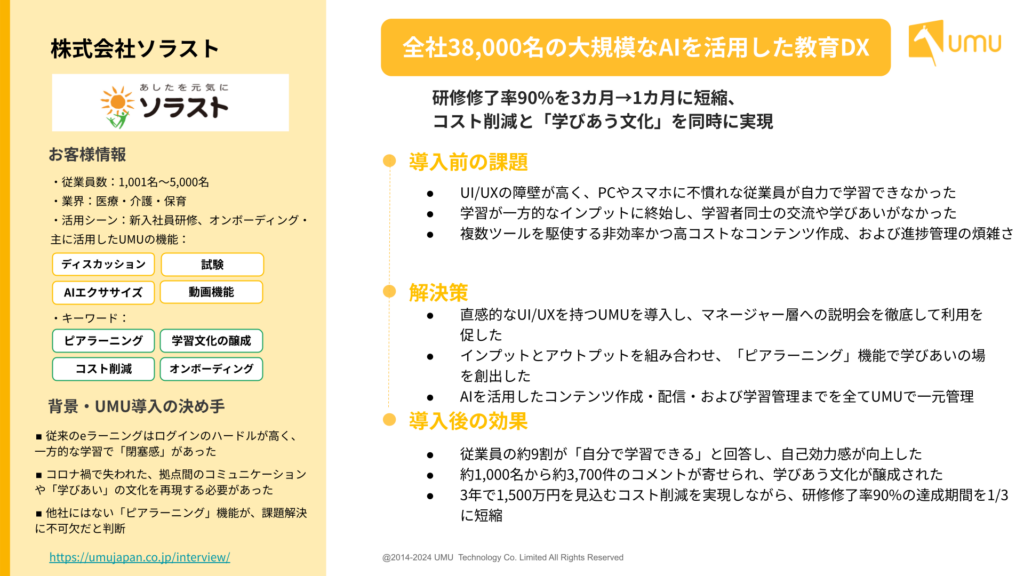 医療・介護・保育の現場を支える株式会社ソラスト。約38,000人の社員が全国で活躍する同社では、従来のeラーニングに「閉塞感」という大きな課題を抱えていました。その状況を打破すべく、学習プラットフォーム「UMU」を導入。社員の学習体験を根底から変え、わずか1カ月で研修修了率90%達成、大幅なコスト削減、そして社員の自己効力感向上という目覚ましい成果を上げています。
