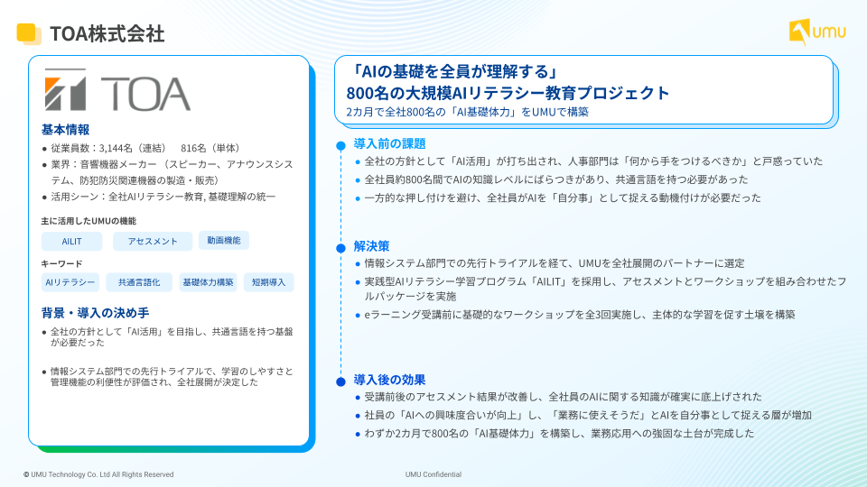 全社方針として打ち出された「AI活用」。TOAはいかにして全社800名の「AI基礎体力」をUMUで築いたか。