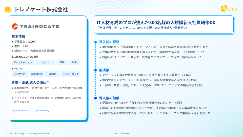 コンペを機に始まった今回のプロジェクトは、トレノケート社のデジタルラーニング事業を発展させる、重要な取り組みとなりました。UMUというパートナーと共に、同社の歩みはこれからも続きます。