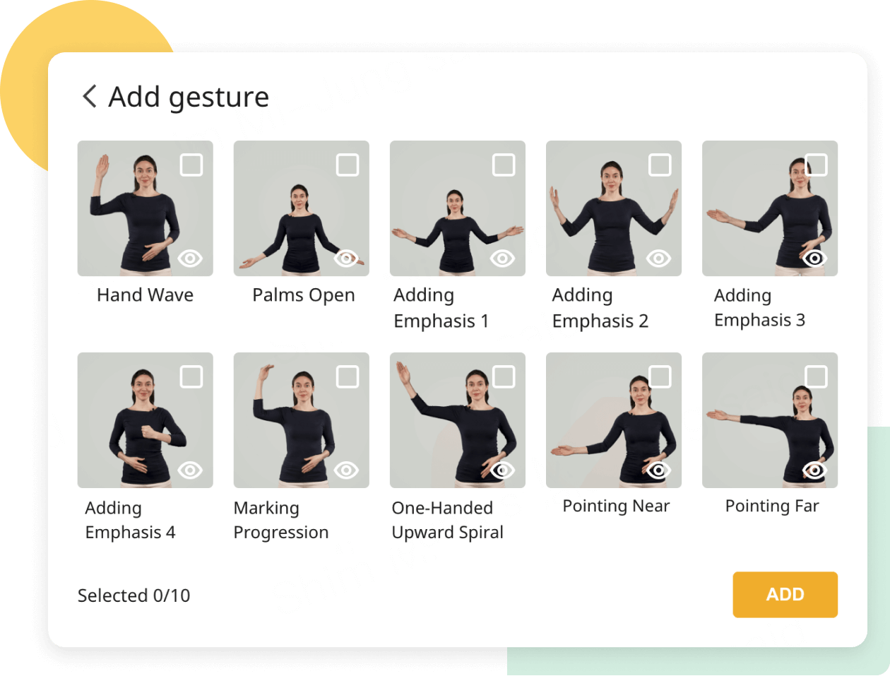AI Gesture Exercise guides learners with pre, mid, and post learning, coaching, and feedback on practice. No more one-on-one training sessions! AI shows learners the gestures they get right and those they get wrong, and tells them how to improve or strengthen their performance to effectively enhance presentation skills.